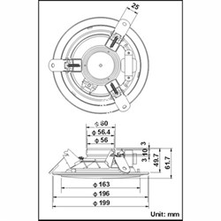 Габариты - диаметр 199мм, высота 62мм, (установочный диаметр 163мм)