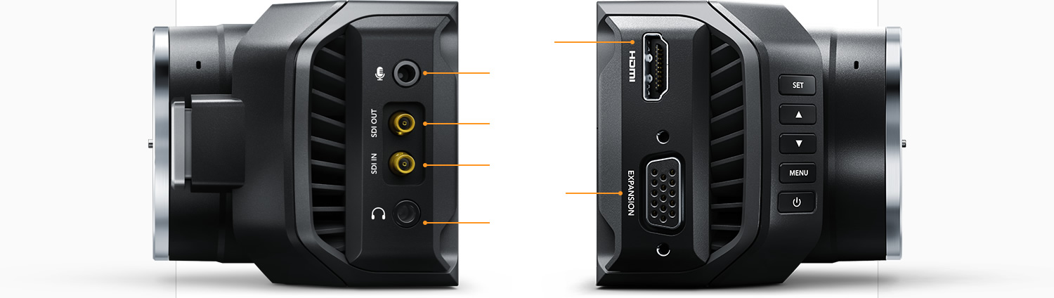 Micro Studio Camera 4K оснащена полноразмерным интерфейсом HDMI для вывода изображения, что позволяет подключать монитор для проверки расположения удаленной камеры или изменения ее параметров с помощью меню. SDI-выход и программный вход с мини-разъемом BNC можно использовать для синхронизации, управления настройками камеры, двусторонней звуковой связи и индикации состояния. Также предусмотрены вход 3,5 мм для подключения внешних микрофонов и гнездо 3,5 мм для iPhone-совместимой гарнитуры.