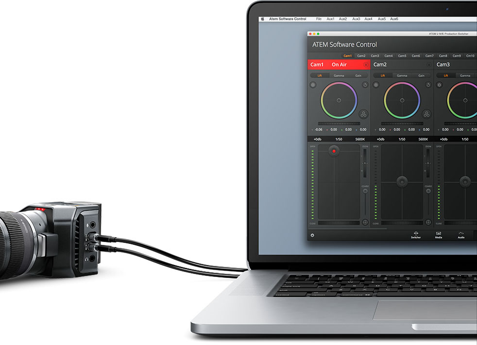 Для управления Blackmagic Micro Studio Camera 4K используется стандартный SDI-протокол. Программный сигнал с любой модели видеомикшера ATEM можно направить на SDI-вход камеры и с его помощью в удаленном режиме изменить любые настройки, а также установить фокус, диафрагму и зум на объективах с поддержкой данной функции. В отличие от традиционной съемочной техники, Micro Studio Camera 4K имеет полноценный инструмент первичной цветокоррекции DaVinci Resolve, который позволяет быстро выполнять глобальную установку цвета при использовании многокамерной конфигурации.