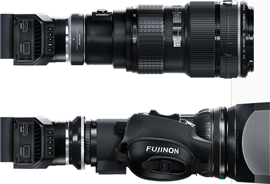При помощи дополнительных адаптеров можно работать с кинообъективами PL или традиционными объективами B4, которые применяются на телевидении. Камера также допускает установку профессиональной оптики Fuji и Canon, а для техники с креплением B4 предусмотрено дистанционное управление с видеомикшера.