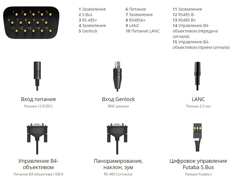 Порт расширения позволяет управлять современными вещательными объективами с креплением B4. Установив адаптер для байонета B4, можно использовать профессиональную видеооптику таких производителей, как Canon, Fuji и другие. Входящий в комплект поставки переходный кабель с разъемом DB-HD15 обеспечивает подключение к модулю управления объективом, а благодаря универсальному дизайну предусмотрено создание собственных решений, в том числе на основе аналоговой оптики предыдущего поколения.